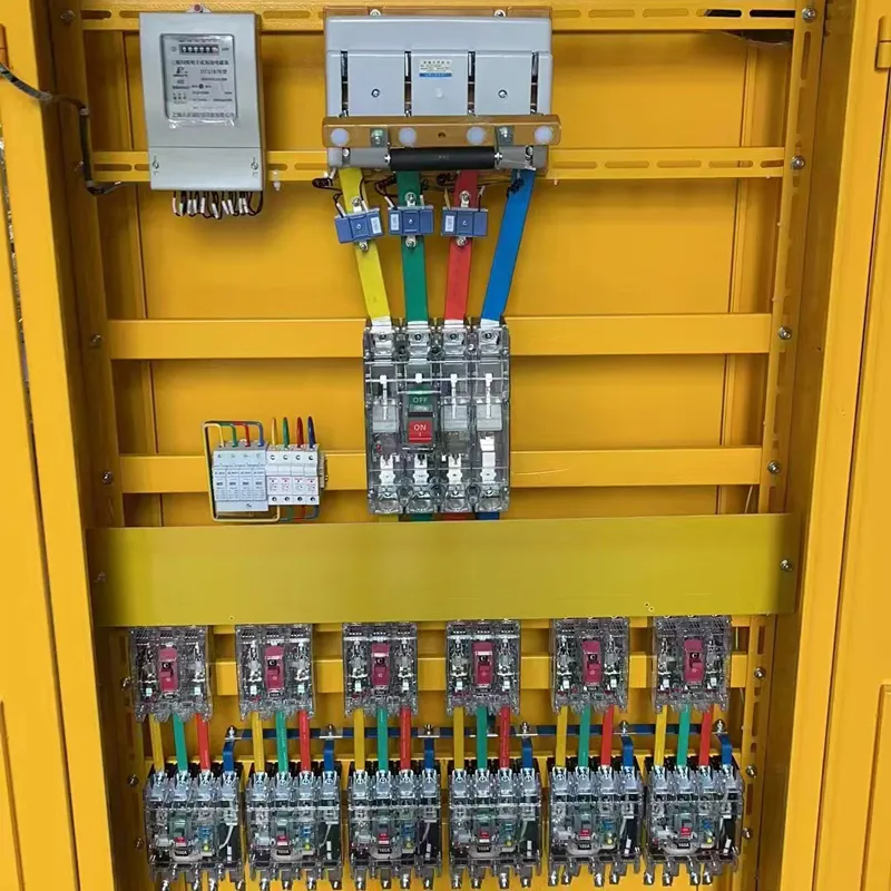 Конструкция корпуса выполнена из высокостойкого желтого/оранжевого металлического материала, обладающего антикоррозийными и ударопрочными свойствами, адаптирована для эксплуатации в открытых и запыленных условиях строительной среды. Внутренняя компоновка отличается упорядоченной структурой, интегрируя главный счетчик электроэнергии, основной автоматический выключатель, многоканальные ответвительные выключатели и модуль защиты от утечки тока, поддерживая вывод более 6 вторичных цепей. Обеспечивается тройная защита от перегрузки, короткого замыкания и утечки тока, позволяя надежно принимать питание с высокой нагрузкой и осуществлять безопасное распределение в соответствии с нормами временного электроснабжения первого уровня на строительных площадках.
